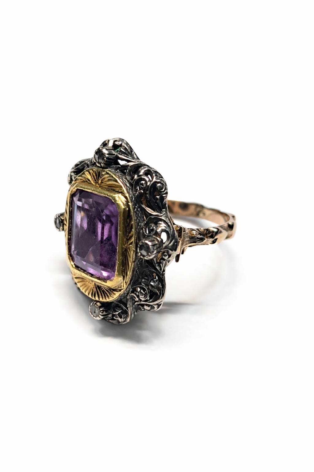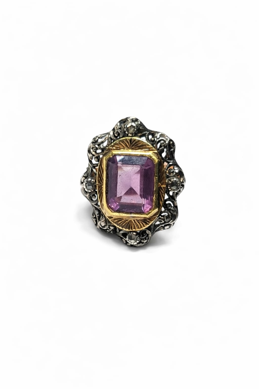 Elegante anello vintage in oro e argento, impreziosito da una splendida ametista viola taglio rettangolare incastonata al centro della montatura. Intorno alla pietra principale si sviluppa una raffinata struttura decorativa in argento con rosette di diamanti, che donano luce e profondità al gioiello.