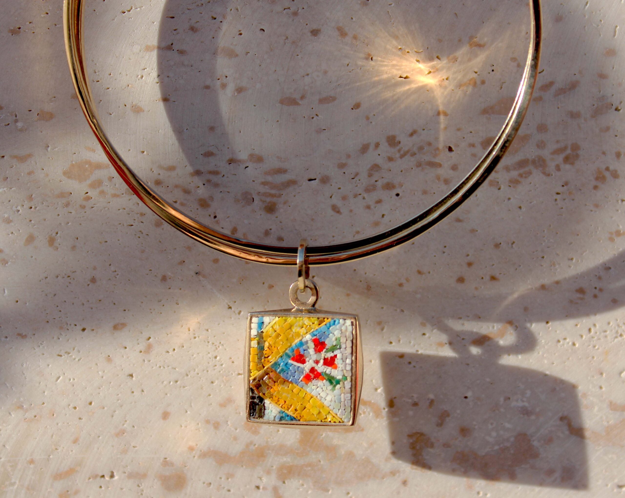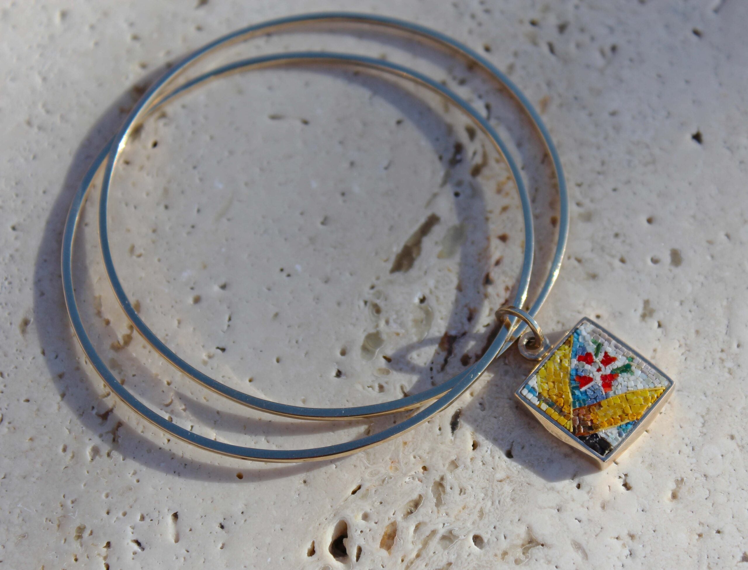 Bracciale a due cerchi con ciondolo Teodora e Giustiniano in Oro Champagne e micromosaico. Pezzo unico.