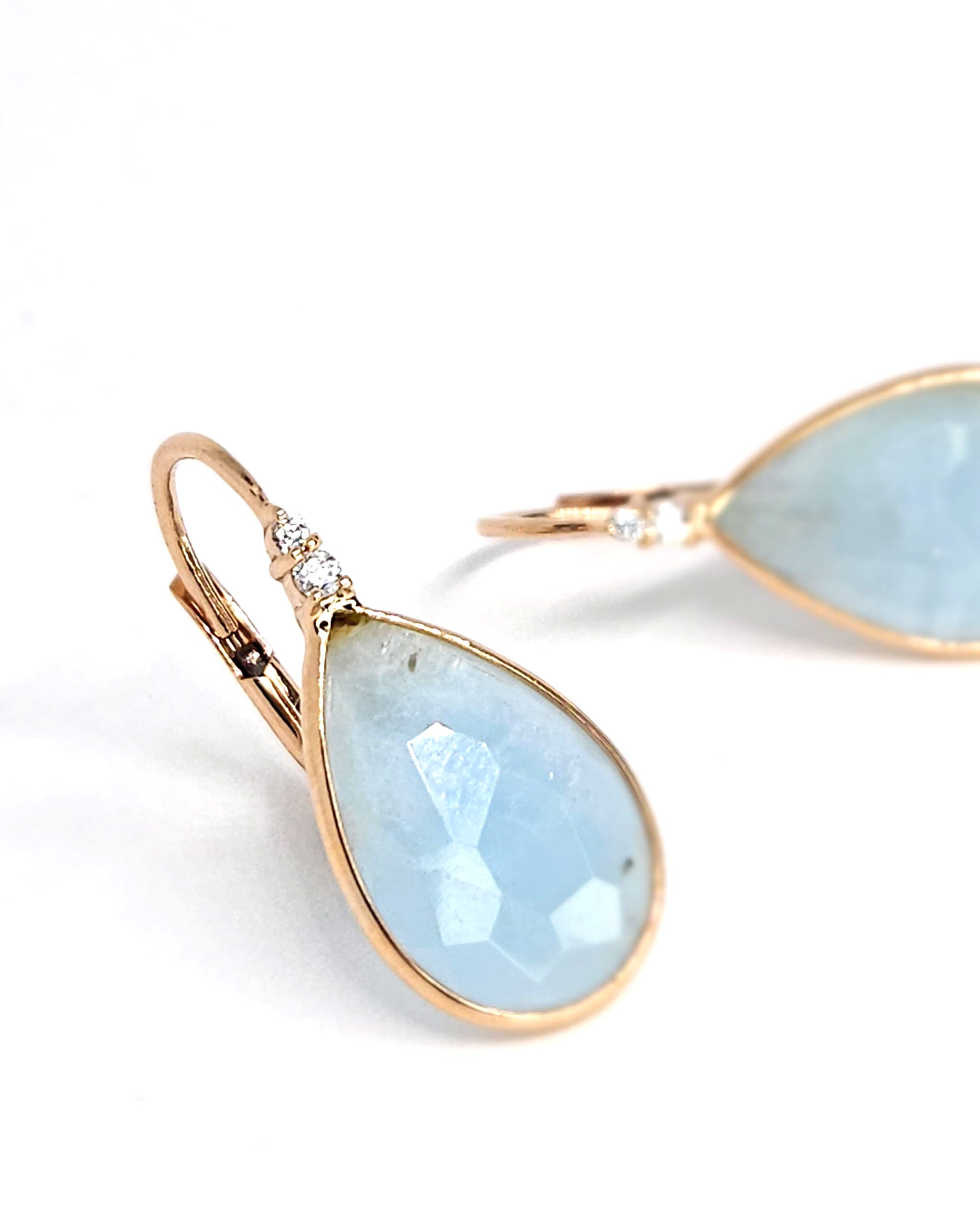 Orecchini in oro rosa 750, acquamarina milk naturale a taglio goccia e diamanti naturali.