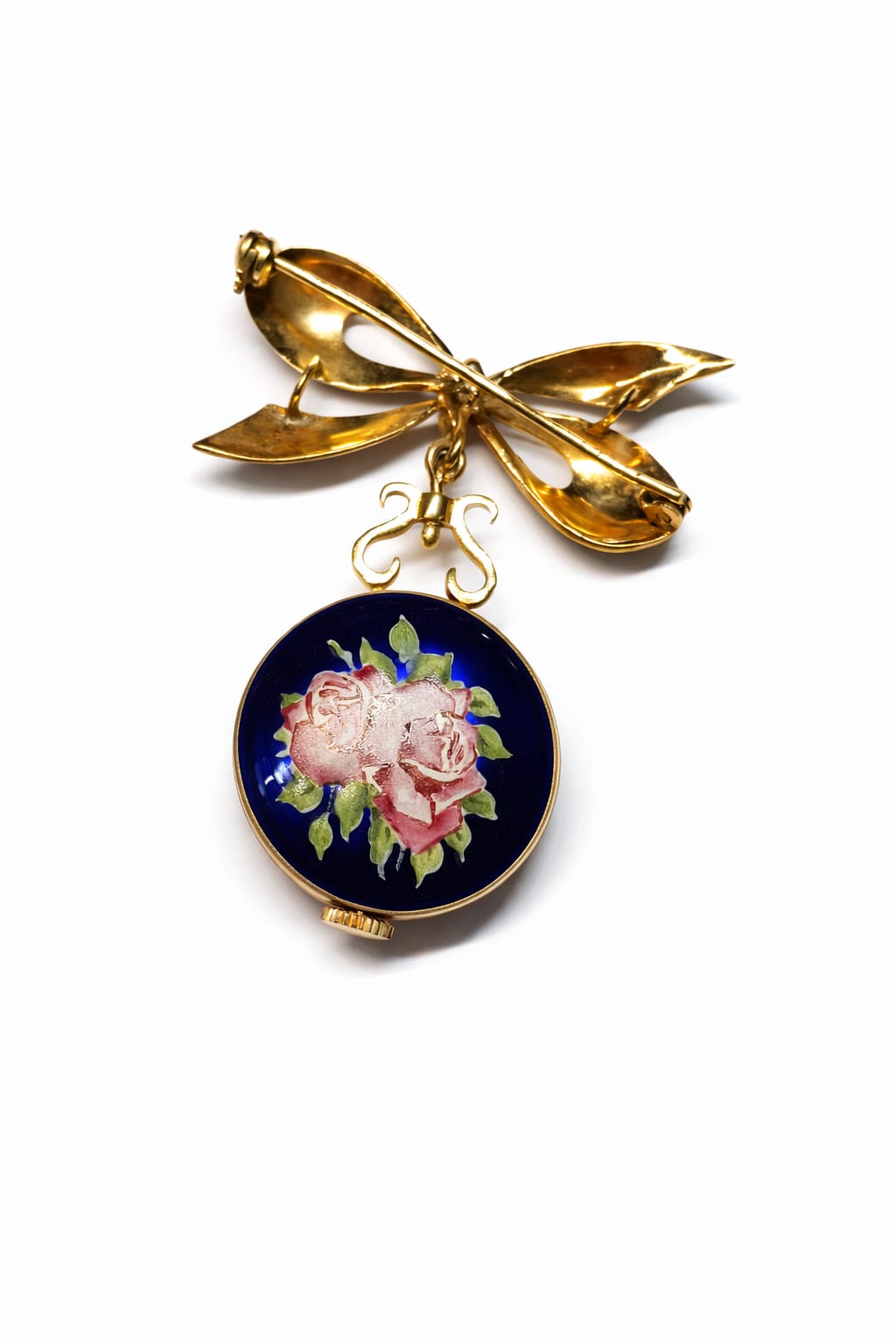 Elegante orologio a spilla, realizzata con raffinato smalto blu decorato da delicati motivi floreali e montatura color oro.